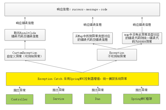 - 捕获到非自定义异常类型首先从Map中找该异常类型是否对应具体的错误代码,如果有则取出错误代码和错误信息并响应给用户,如果从Map中找不到异常类型所对应的错误代码则统一为99999错误代码