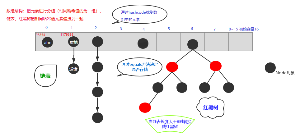 bucket中存储一个元素,即一个Node对象,但每一个Node对象可以带 一个引用变量next,用于指向下一个元素,因此,在一个桶中,就有可能 生成一个Node链。也可能是一个一个TreeNode对象,每一个TreeNode对象可以有两个叶子结点left和right,因此,在一个桶中,就有可能生成一个TreeNode树。而新添加的元素作为链表的last,或树的叶子结点。JDK7 底层结构只有:数组+链表。JDK8 中底层结构:数组+链表/红黑树。